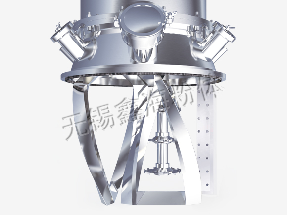 在行星架上有一刮壁刀隨行星架轉(zhuǎn)動,緊貼桶壁不斷的刮拭,桶壁經(jīng)大型立車精加工后,再經(jīng)大型自動拋光機(jī)拋光,確保行星架上的活動刮刀在旋轉(zhuǎn)時(shí)把桶壁的物料完全刮掉,使桶壁無滯留料,提高混合效果。