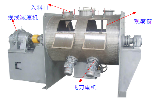 臥式圓筒體作盛物料用,筒體上開有若干孔,供進出料、觀察用。犁刀軸支承座固定在筒體二端的蓋板上。